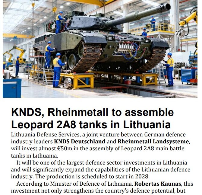 This issue tracks a major leap in Baltic defence industrial capacity: a German-backed plan to assemble Leopard 2A8 tanks in Lithuania and Lithuania’s €252m CAESAR Mk II artillery purchase. We also cover a record Estonian defence-tech delegation to Berlin, new DefSecIntel–TYTAN counter-drone cooperation, and leaders’ pledge to deliver Rail Baltica on schedule. Plus: a €1.8bn military base build-out for the German brigade in Lithuania, Latvia’s LMT transformation into a tech group, and fresh insight into the (often unseen) scale of Estonia’s defence startup and investment ecosystem.